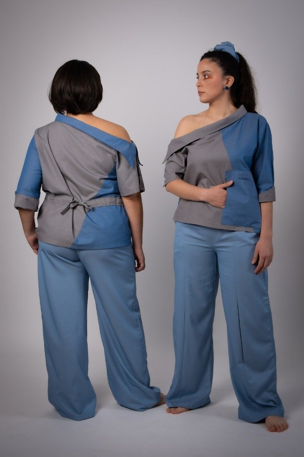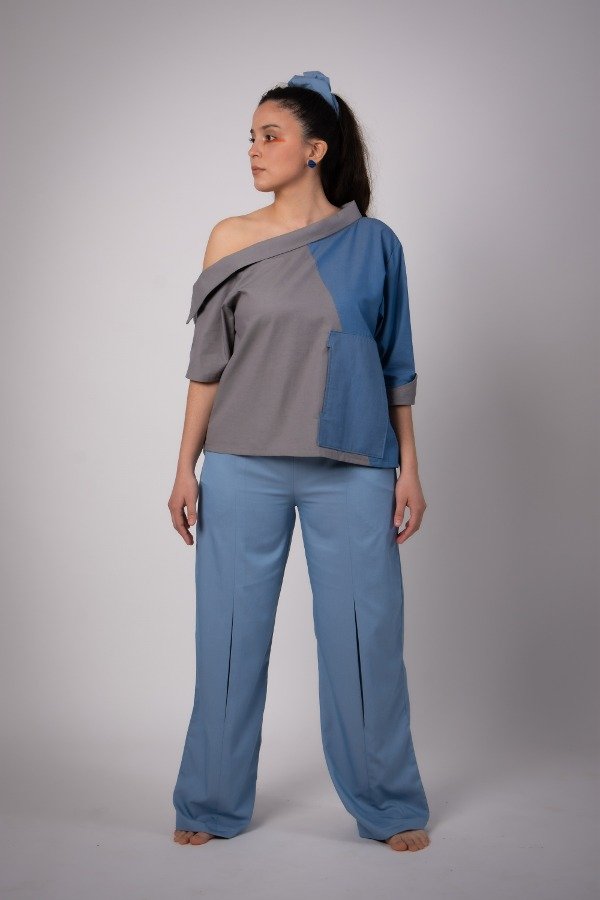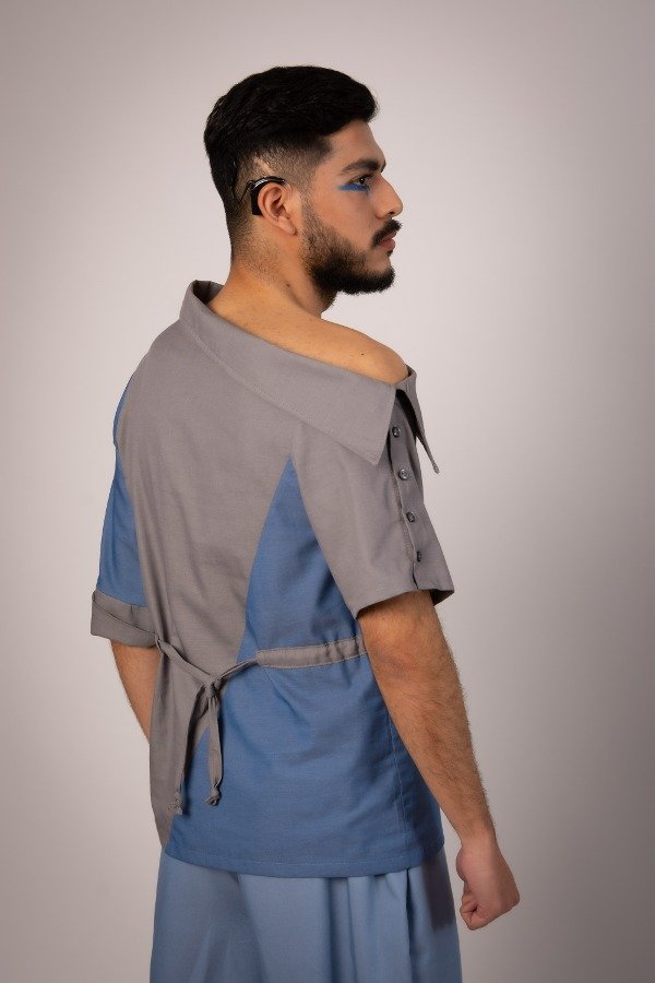 Camisa Aureliano es una prenda suelta, con recortes, combinados en gris y azul, cuello caído en hombro con botones en manga, y espalda ajustable con tiras.