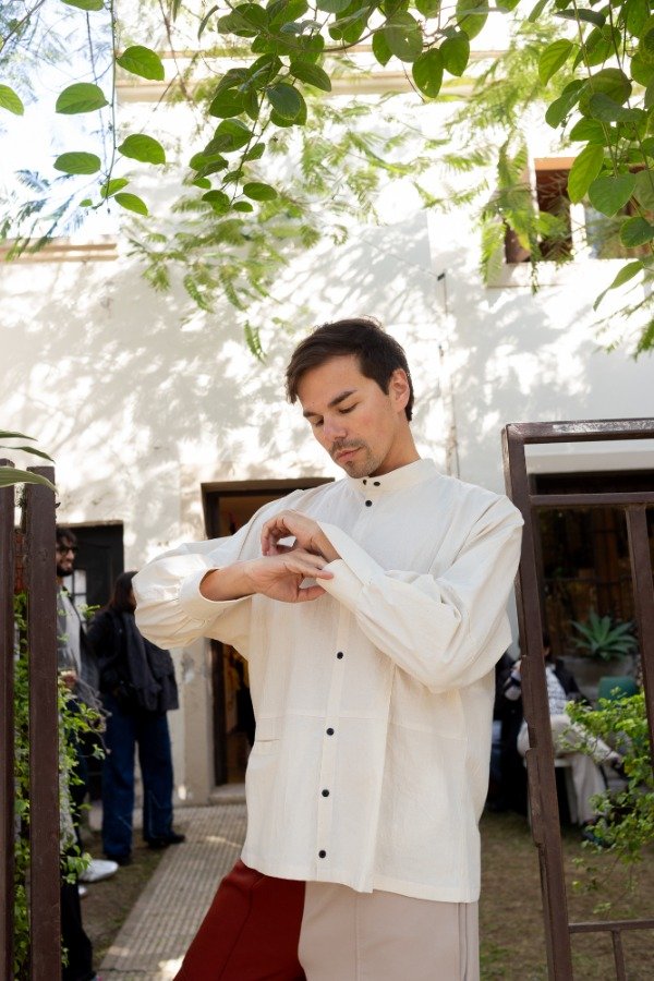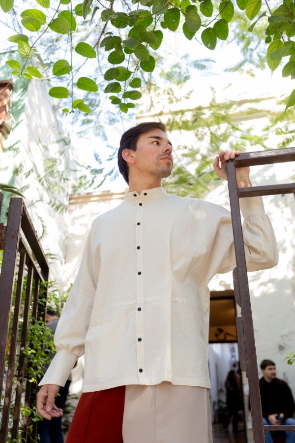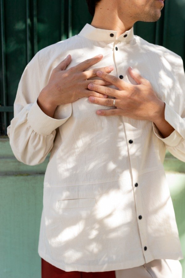 Camisa realizada en tusor liviano 100 % algodón, con bolsillo escondido en frente. Tablón en espalda. Botones a contra tono. Con cuello mao y puños con forma asimétrica, dando detalle y calidez al diseño. Es una prenda oversize. La puedes pedir en tu taller, y en los colores negro, rosa, natural, naranja, verde o avellana.