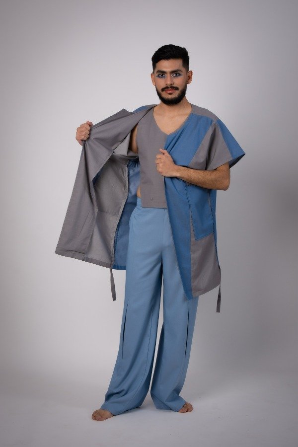 Kimono Renata, cuenta con recortes a lo largo de la prenda, combinando gris y azúl, con bolsillos a los lados, y tiras para ajustar en costados.