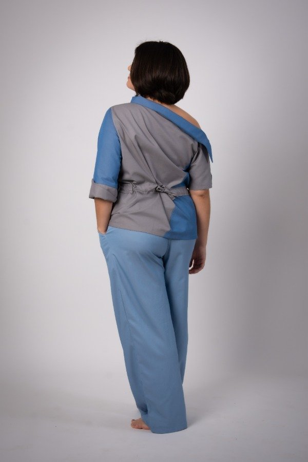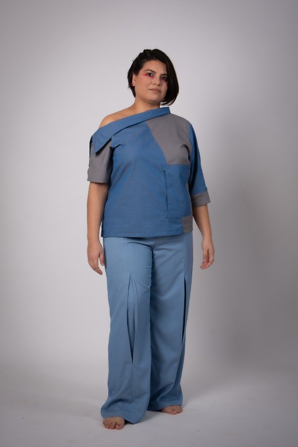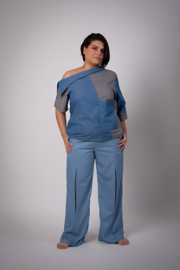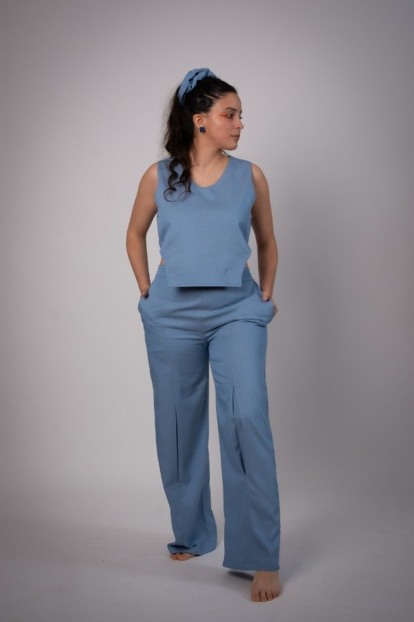 Pantalón Rebeca tiro alto, en color celeste con tablón en el centro de la pierna, y abertura en rodilla creando un corte a lo largo de la pierna, en espalda cuenta con elástico para dar mayor comodidad, si no encuentras tu talle o no hay stock podes pedir el tuyo y en 15 días lo tenemos listo.
