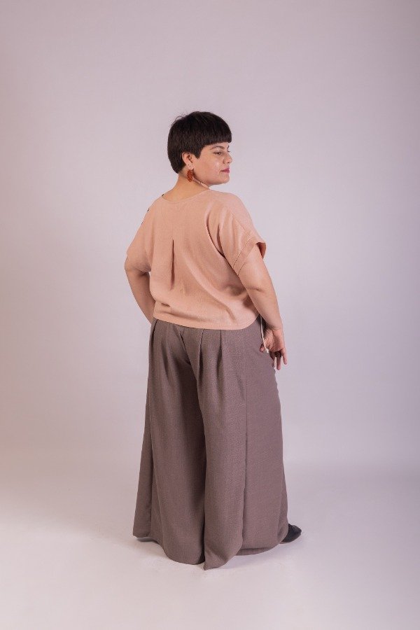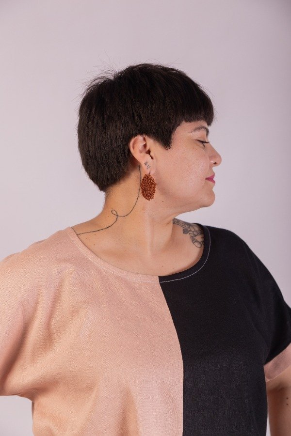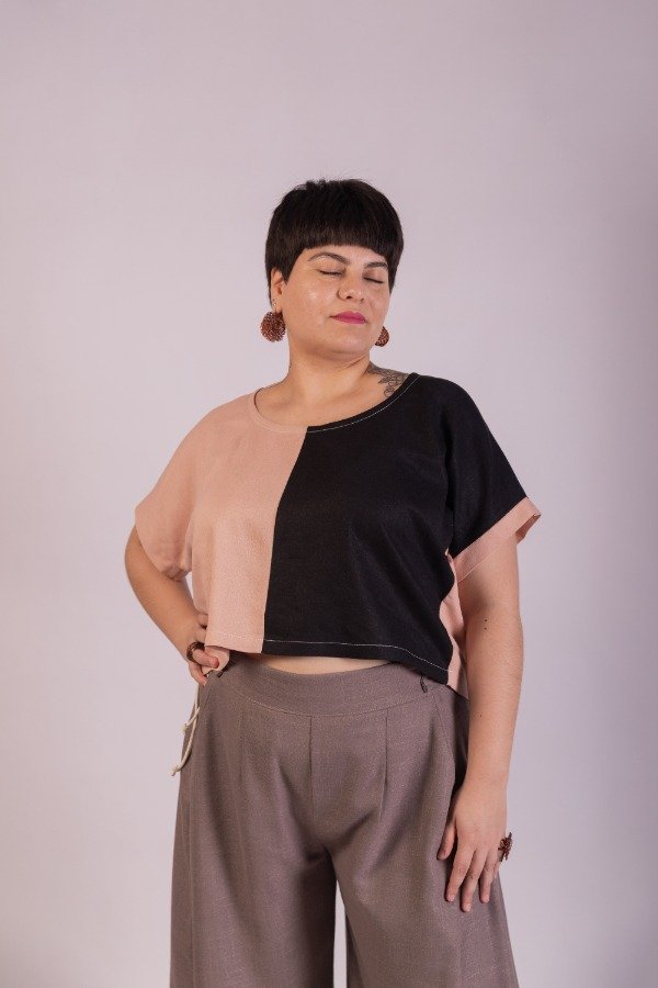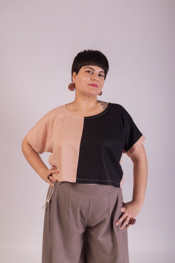 Remera manga caída, de lino, combinada en frente rosa y negro. en espalda tablón. Amplia y cómoda.