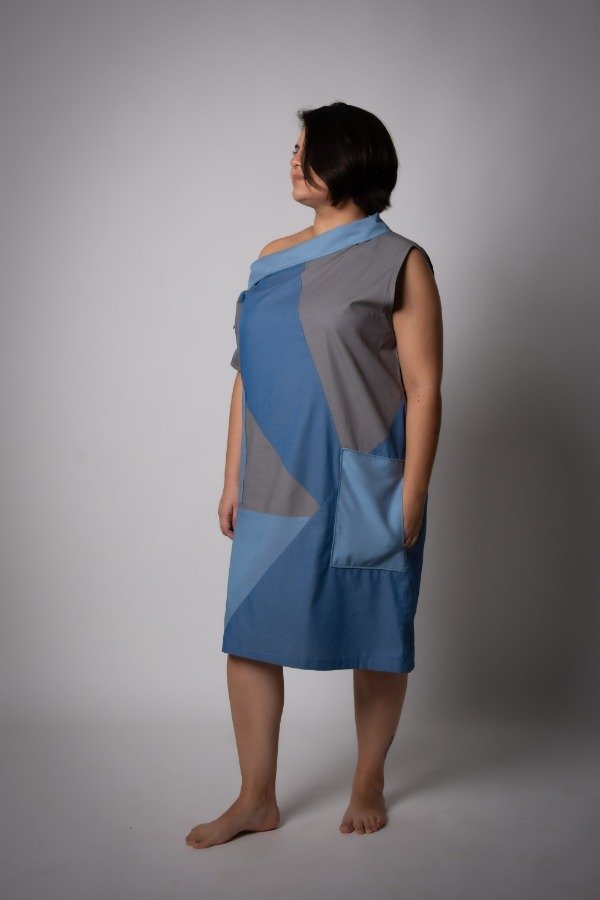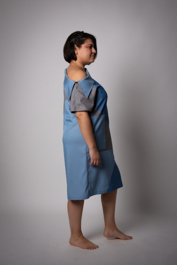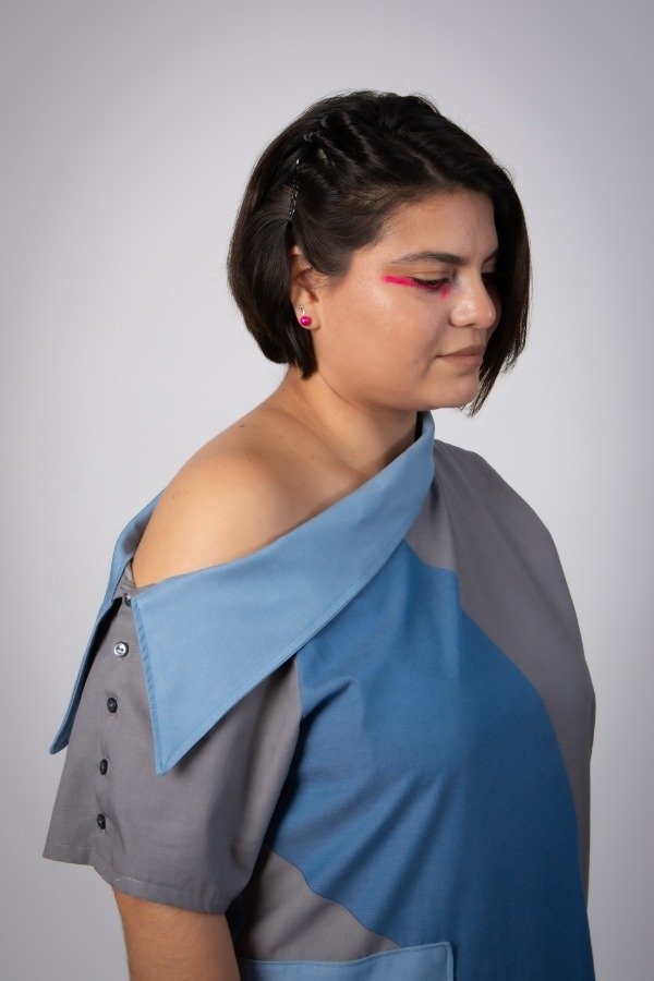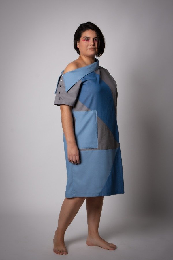 Vestido Nicanor, con recortes combinando colores, celeste, gris, y azul, con bolsillos en distintas alturas. Hombro caído y cuello a la manga con botones en manga.